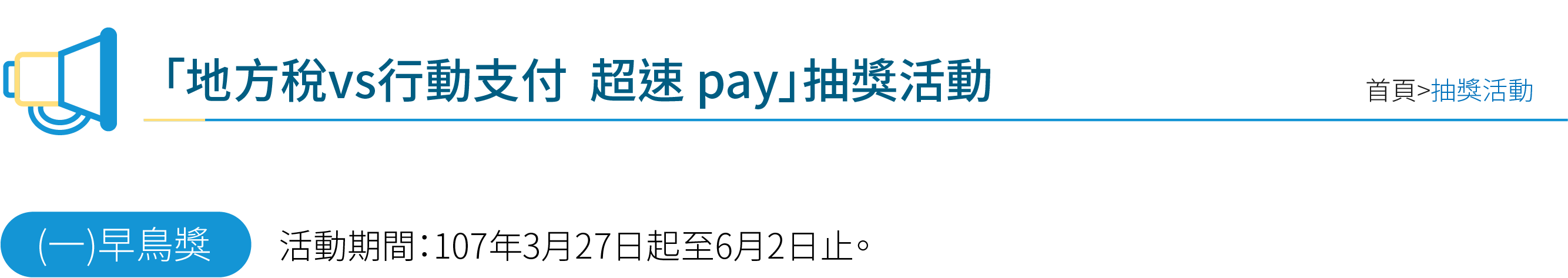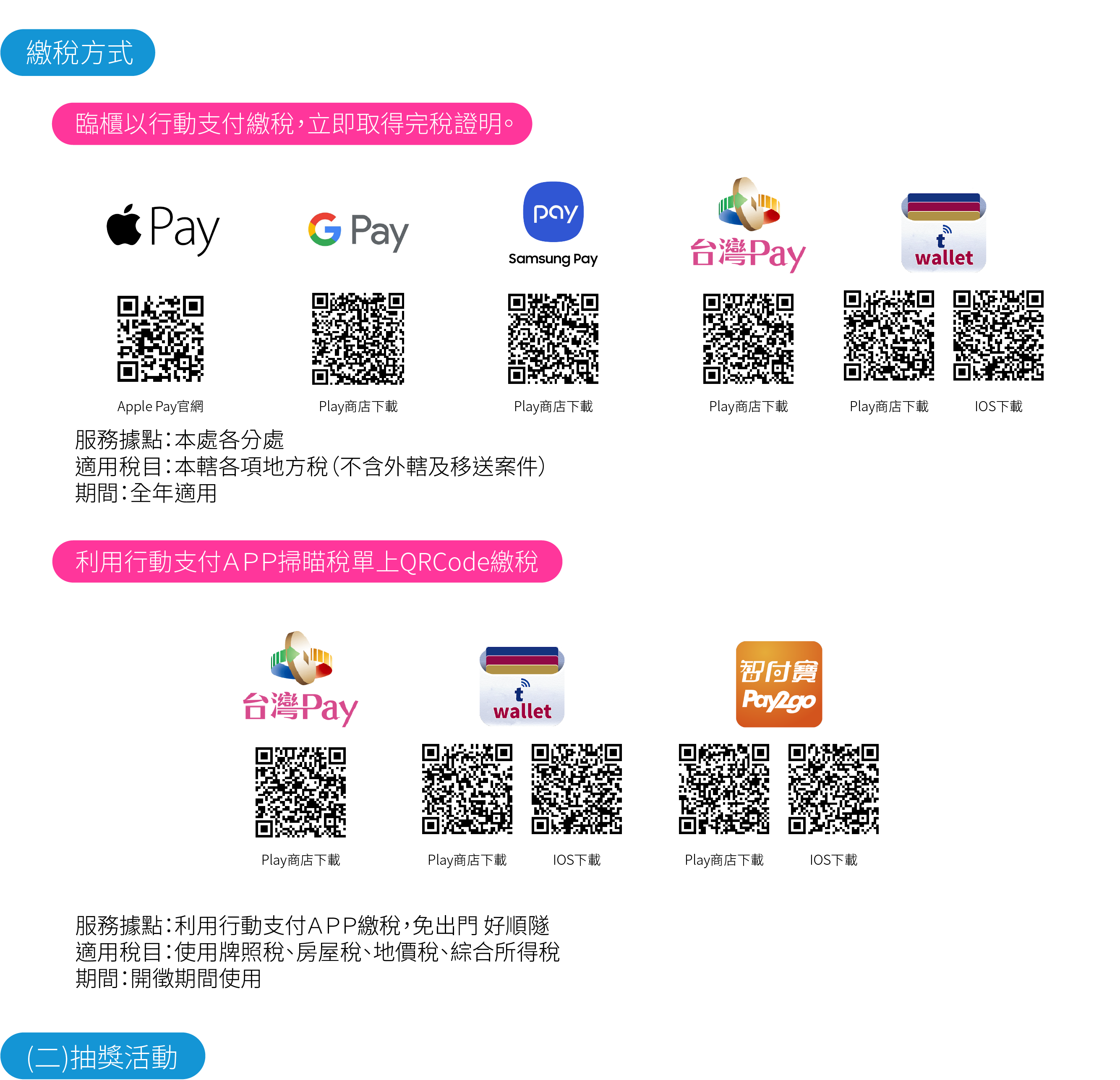 以行動支付每繳納1筆地方稅款,即可獲得1次抽獎機會(每人中獎乙次為限,獎項從優獲得)。